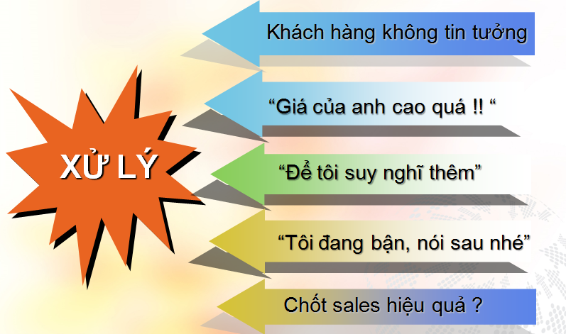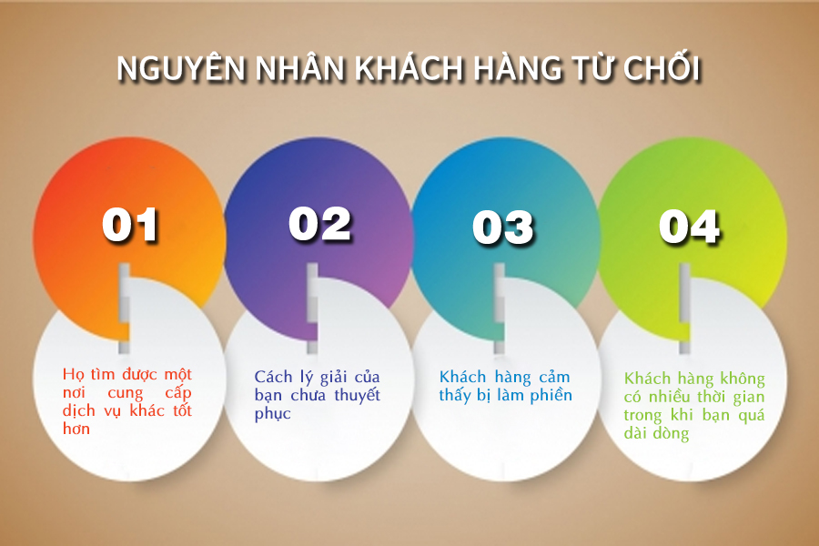 Trước hết ta phải hiểu từ chối cũng chính là cơ hội. Lời từ chối xảy ra chính là thời điểm việc bán hàng thực sự bắt đầu. Việc từ chối gần như trở thành một phần trong chu trình bán hàng. Nếu khách hàng im lặng giống như một bức tường, thì người bán hàng khó lòng biết mong muốn ẩn sâu. Những lời phàn nàn về giá cao, kém ưu thế hơn khi cạnh tranh với đối thủ là đầu mối để người bán hàng có thêm cơ hội để tư vấn. Có một số lý do khiến khách hàng từ chối như: không có nhu cầu, không có mong muốn, không có thời gian, không có niềm tin, không có tiền hoặc giá quá cao. Chính vì vậy, các doanh nghiệp cần phải lên sẵn các câu trả lời cho từng nhóm từ chối, đưa vào các chương trình đào tạo; các câu hỏi luyện tập phải hóc búa hơn so với thực tế doanh nghiệp để nhân viên quen dần với các tình huống. Vậy làm thế nào để xử lý tốt các tình huống khi khách hàng từ chối? Chú ý rằng thay vì nhảy vào giải đáp ngay, người bán cần tìm hiểu sâu hơn các lý do, để đưa ra giải pháp phù hợp. Ngoài ra, trong các lời từ chối, giá cả là tình huống phổ biến nhất, cần có nhiều phương pháp xử lý riêng. Ví dụ nếu khách hàng phàn nàn: Trời ơi! Sao bán đắt vậy em? Trong trường hợp này cách hợp lý nhất là hãy xoa dịu khách hàng bằng cách thể hiện sự đồng cảm đối với những băn khoăn của họ. Chẳng hạn, bạn có thể trả lời: “Dạ, em cảm ơn anh/chị. Em hoàn toàn hiểu những băn khoăn của anh chị… Và nếu bước xoa dịu của bạn thành công, khách hàng sẽ cảm thấy mình được quan tâm và tôn trọng và tất nhiên họ sẽ không còn quá gay gắt với bạn nữa.